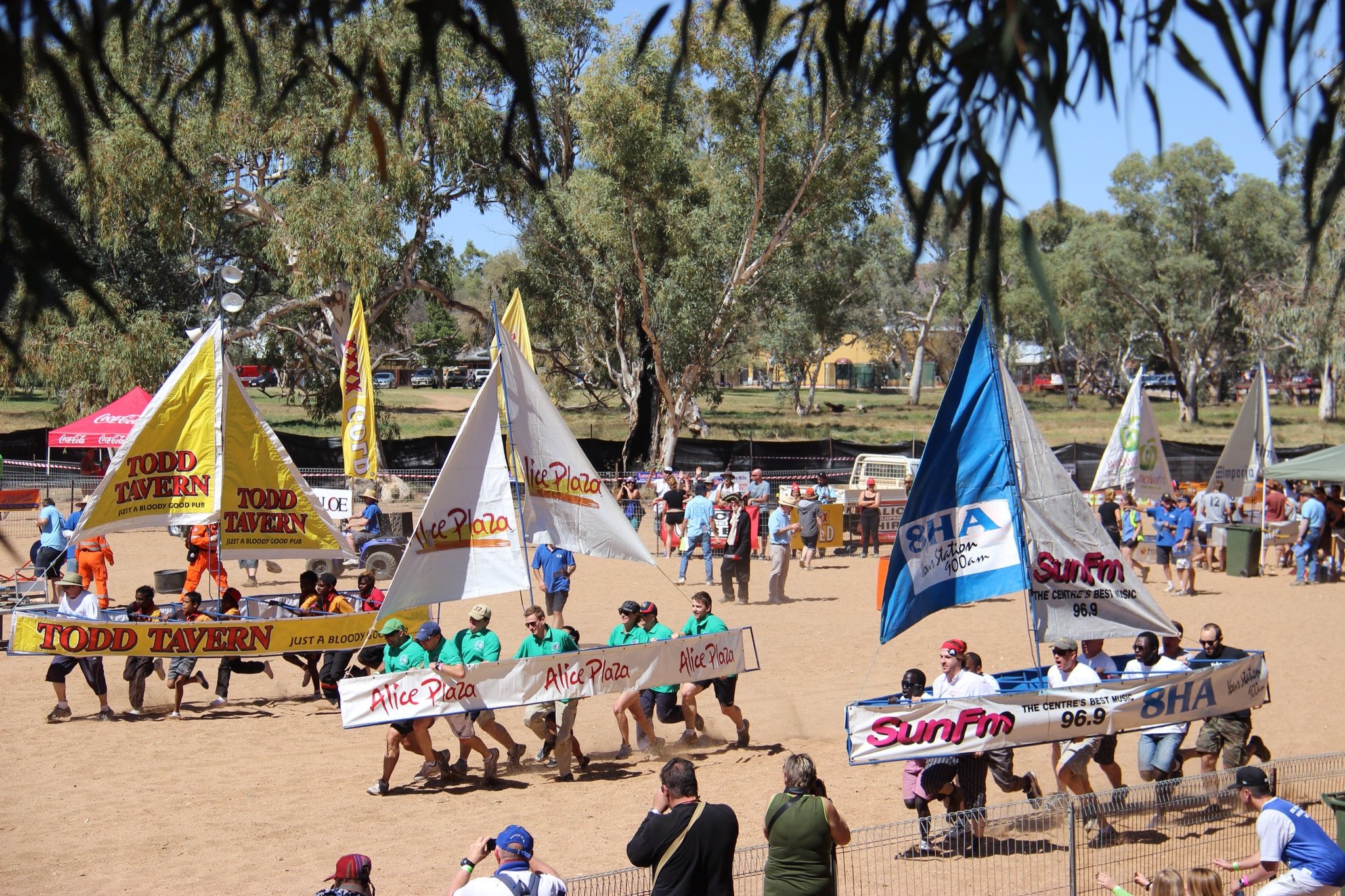 Еще одни необычные соревнования проходят в Австралии, на дне высохшей реки Тодд. У лодок убирают дно, и спортсменам нужно нести свое «плавсредство» в руках и быстро-быстро бежать. Если хоть один гонщик споткнется и упадет — команда проигрывает.