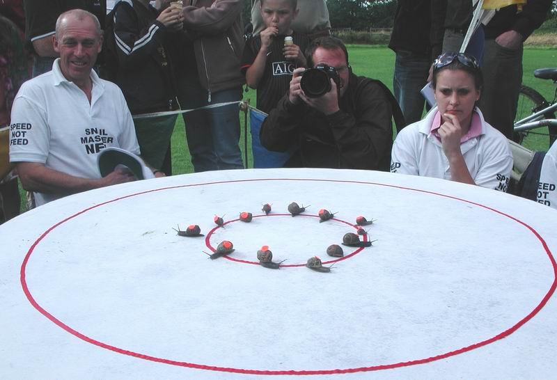 Трудно назвать это соревнование гонками, но все же. На ежегодные забеги улиток приходят посмотреть немало болельщиков, да и желающих поучаствовать всегда хватает. На улиток приклеивают номера, складывают их в центре круга, а дальше сидят, подбадривают спортсменов и ждут.