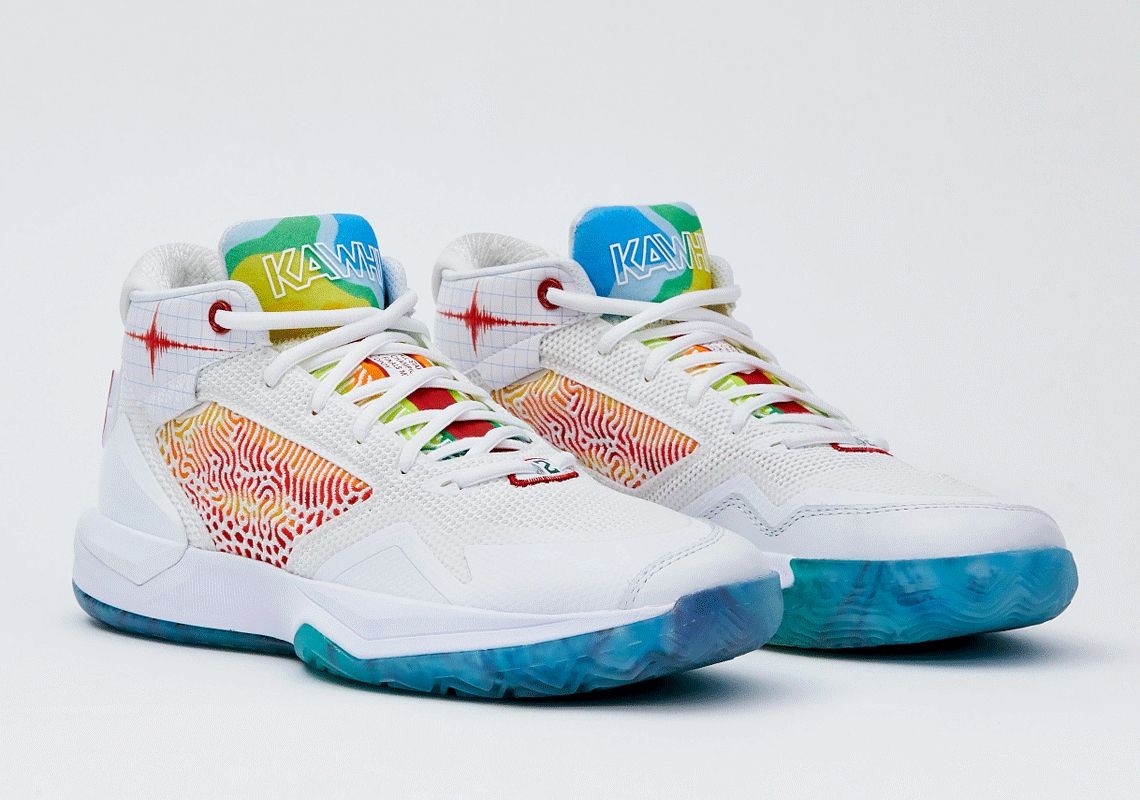 Модель New Balance Kawhi имеют белый текстильный верх с разноцветным язычком и вышивкой на боковых частях. Среди элементов дизайна — изображение звуковой дорожки, логотип Кавая в виде буквы «K», его игровой номер «2» внизу шнуровки, автограф на верхней части задника и крупный выпуклый логотипом NB. Завершает дизайн полупрозрачная голубая подошва, которая прекрасно сочетается с оттенками язычка и боковой вышивкой.